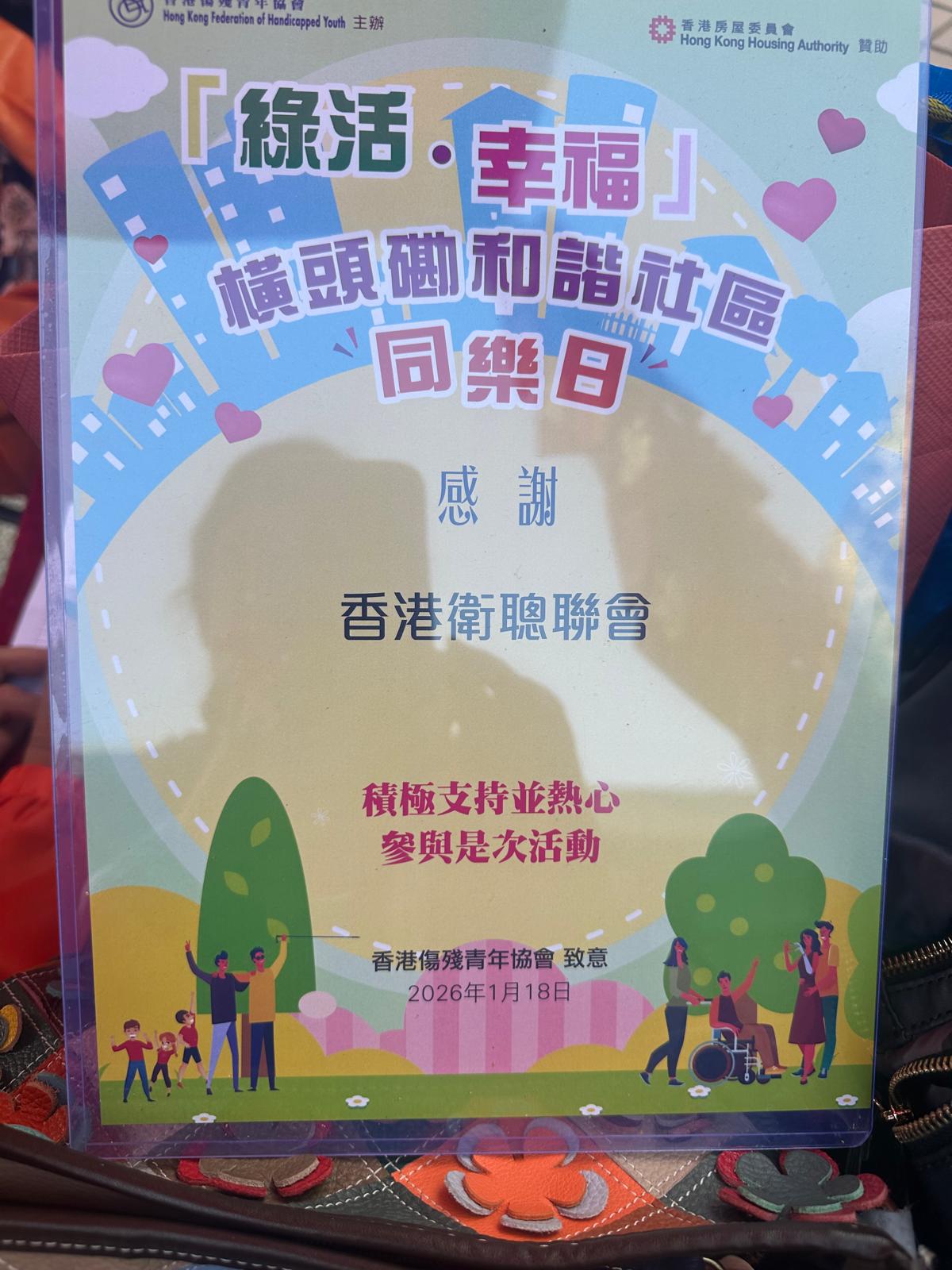 | 香港衞聰聯會(“本會”) 於2026年1月18日參與由香港傷殘青年協會主辦及香港房屋委員會贊助的「綠活。幸福」橫頭磡和諧社區同樂日。本活動在樂富橫頭磡邨4期廣場舉行,本會會員義工在本活動設立攤位遊戲及參與表演項目,實行與眾同樂,歡渡愉快週日。 | ||||