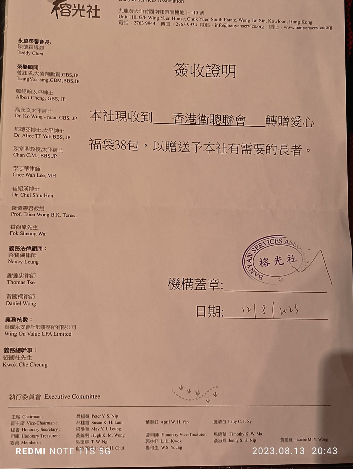 | 香港衞聰聯會(“本會”) 於2023年8月中旬捐贈38包福袋予榕光社,惠及更多有需要人士。 | ||||