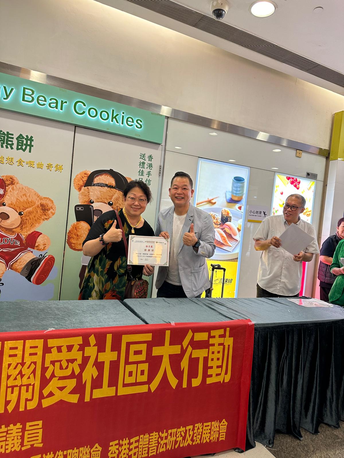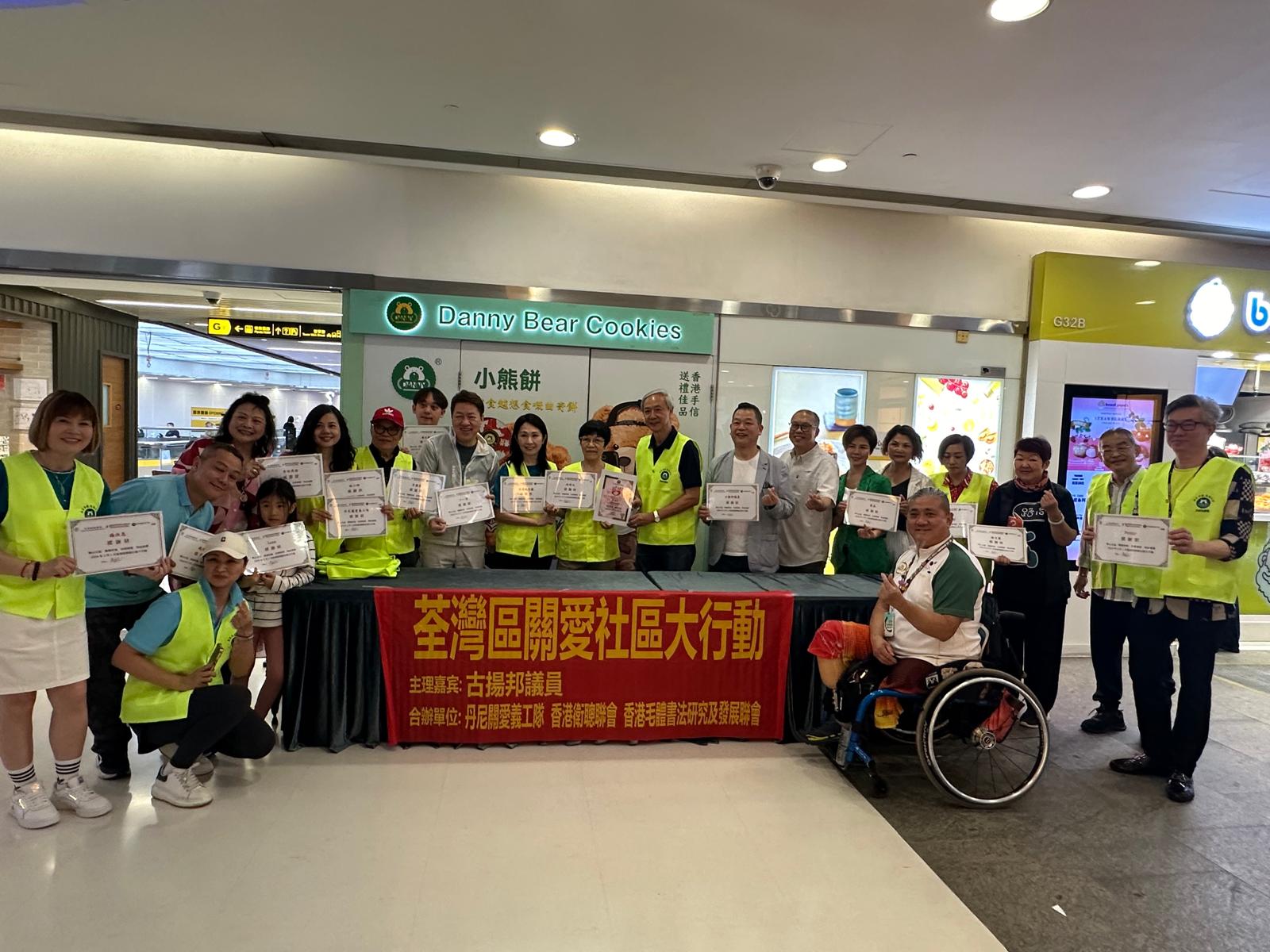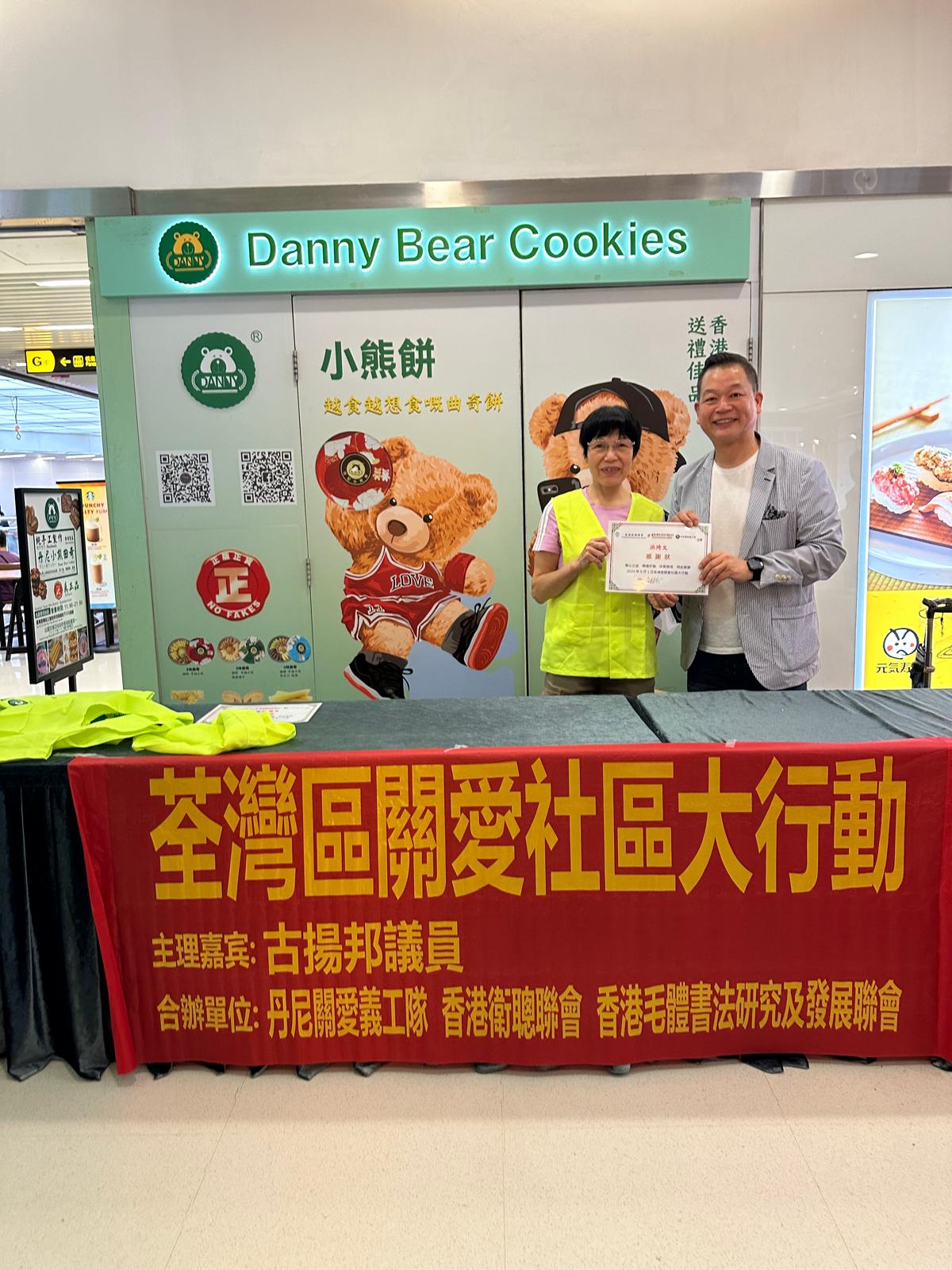 香港衞聰聯會(下稱︰本會) 於2024年5月1日下午與丹尼關愛義工隊及香港毛體書法研究及發展聯會假荃灣悅來酒店商場合辦「荃灣關愛社區大行動」(下稱︰本活動),並邀請荃灣古揚邦區議員擔任本活動主禮嘉賓。本活動亦邀請藝人、本會義工及地區各友好擔任嘉賓,在勞動節假期參與這有意義活動。 本活動向該區基層人士派發福袋,福袋內容非常豐富,希望以解該區基層人士生活物資所需之急,而在場參與本活動的眾人都感到非常有意義及開心。本活動為感謝各位嘉賓到來支持參與,丹尼關愛義工隊代表向主禮嘉賓古議員及邀請古議員向各位嘉賓頒發感謝狀以表謝意。 |