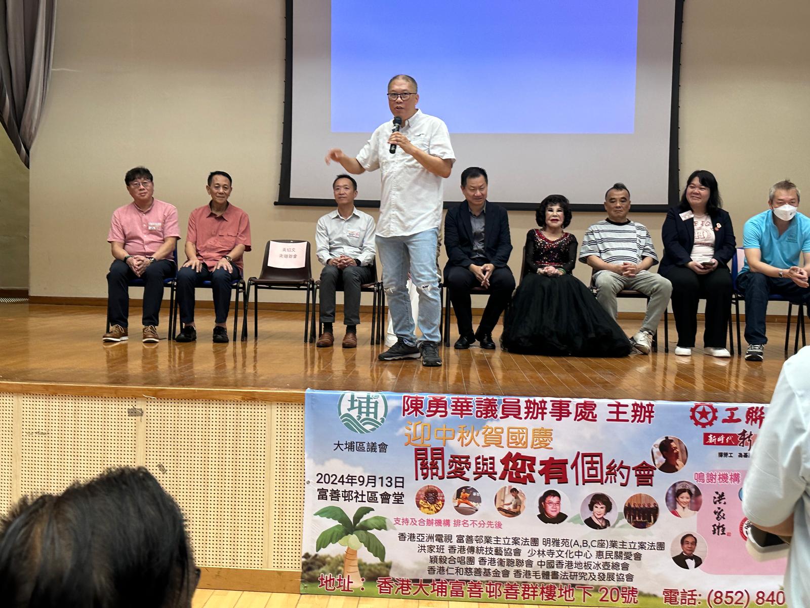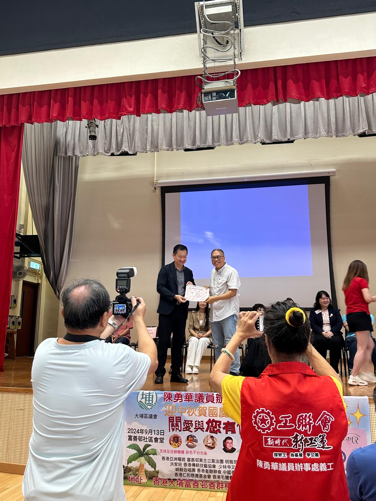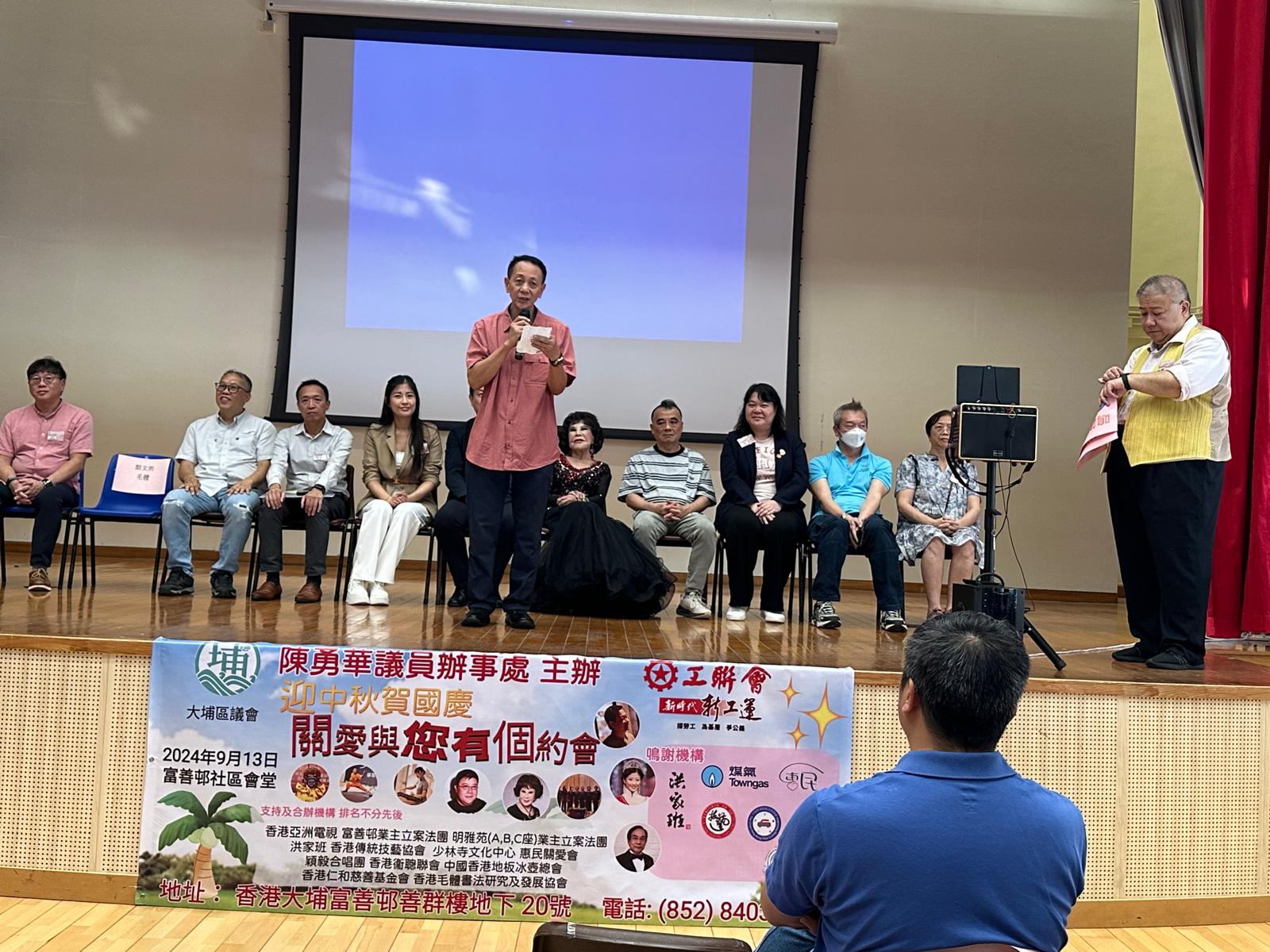 由陳勇華區議員辦事處主辦及惠民關愛會、香港傳統技藝協會、少林寺文化中心、香港職業傷病聯盟、中國香港地板冰壺總會、香港毛體書法研究及發展協會及香港仁和慈善基金會合辦的「賀國慶、迎中秋」關愛和您有個約會的大型活動。本會當天派出義工協助活動及會員到場參與,亦與他們共晉午膳聯誼。 當天活動盛大,由著名藝人劉錫賢先生擔任活動主持,並邀請黃夏蕙女士表演及香港小姐周家蔚女士代表洪家班到場支持。另有不同非常精彩的中國傳統技藝表演及向全場觀眾派發應節福袋,氣氛熱烈,樂也融融,共同歡慶祖國75周年華誕及喜迎中秋佳節。 |